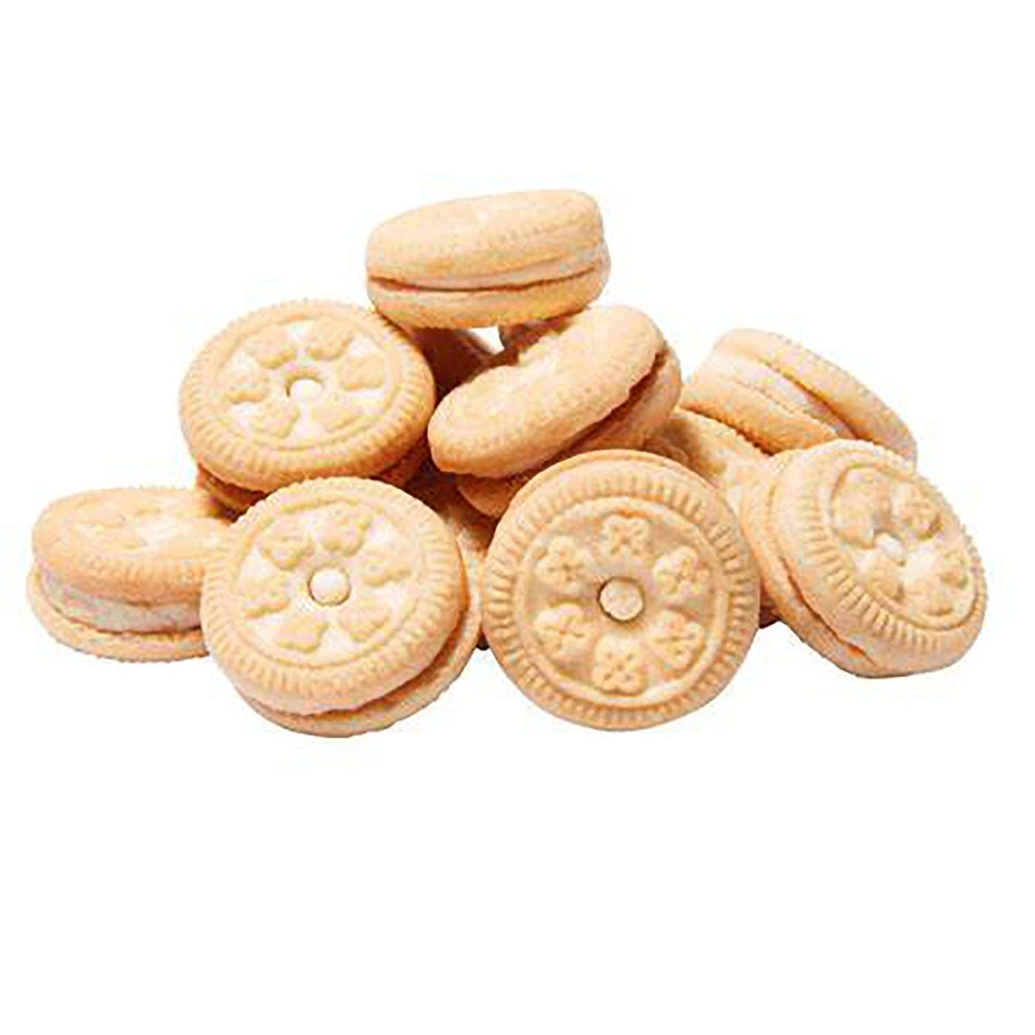 Grandma's Mini Vanilla Cream Cookies in a bag offer sweet, creamy flavor between two golden vanilla cookies. A nostalgic treat with just the right crunch.