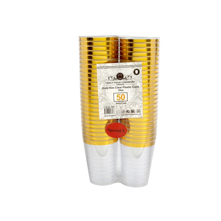 - Clear cups with metallic gold trim